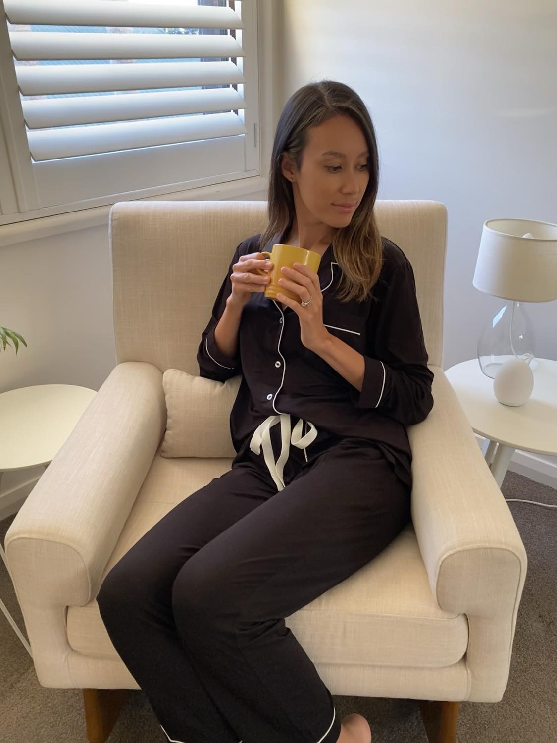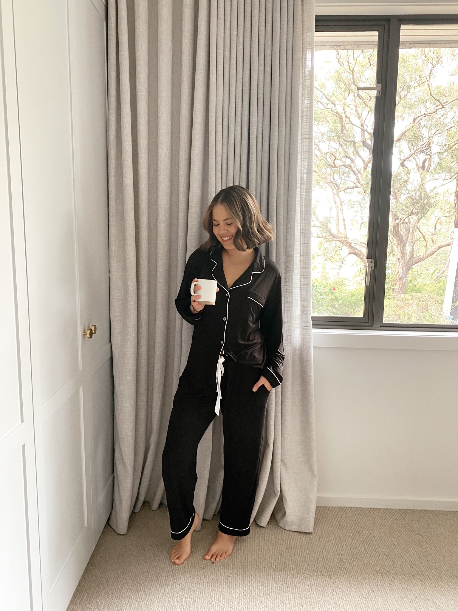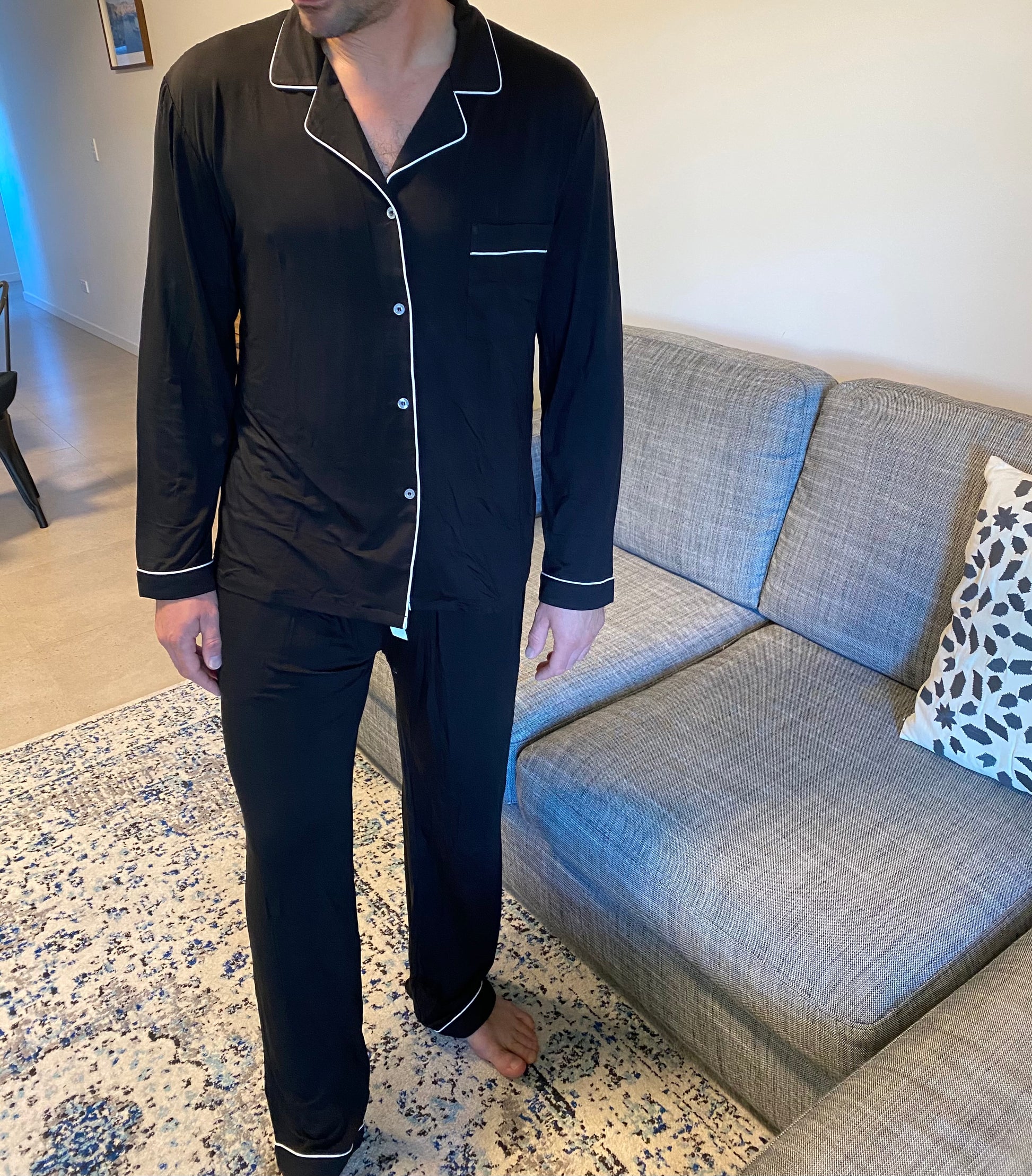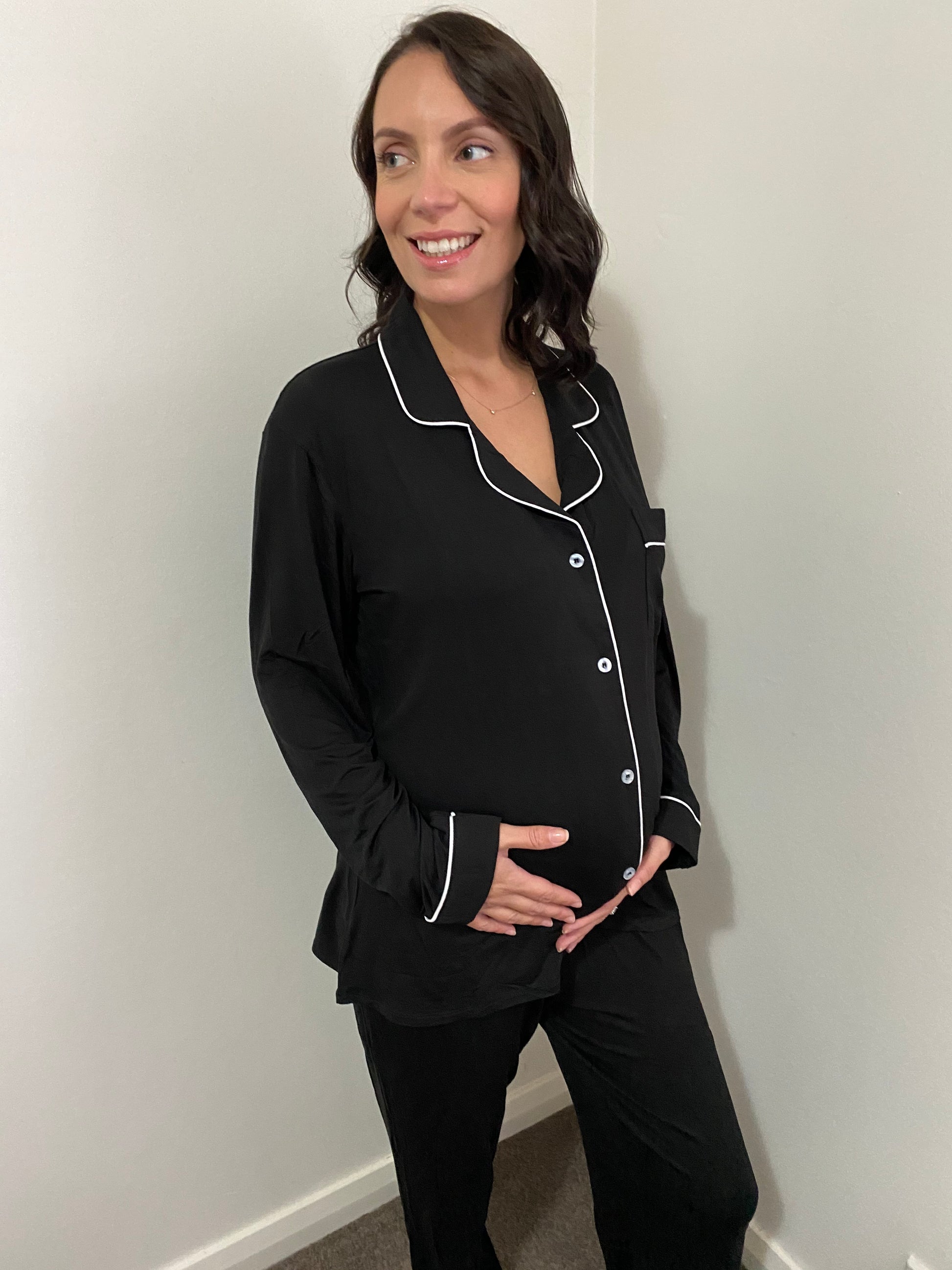 Our Midnight Fantasy Bamboo Long Set with white Piping is the epitome of comfort meets sophistication. The material is crafted from luxuriously soft 95% Bamboo and 5% Spandex making it comfortable, breathable and stretchy. It has an elasticised waistband, pocket on the top and pants and mother of pearl button up for the top. Whether you're unwinding after a long day or lounging on lazy weekends, these pyjamas offer the perfect blend of style and relaxation.