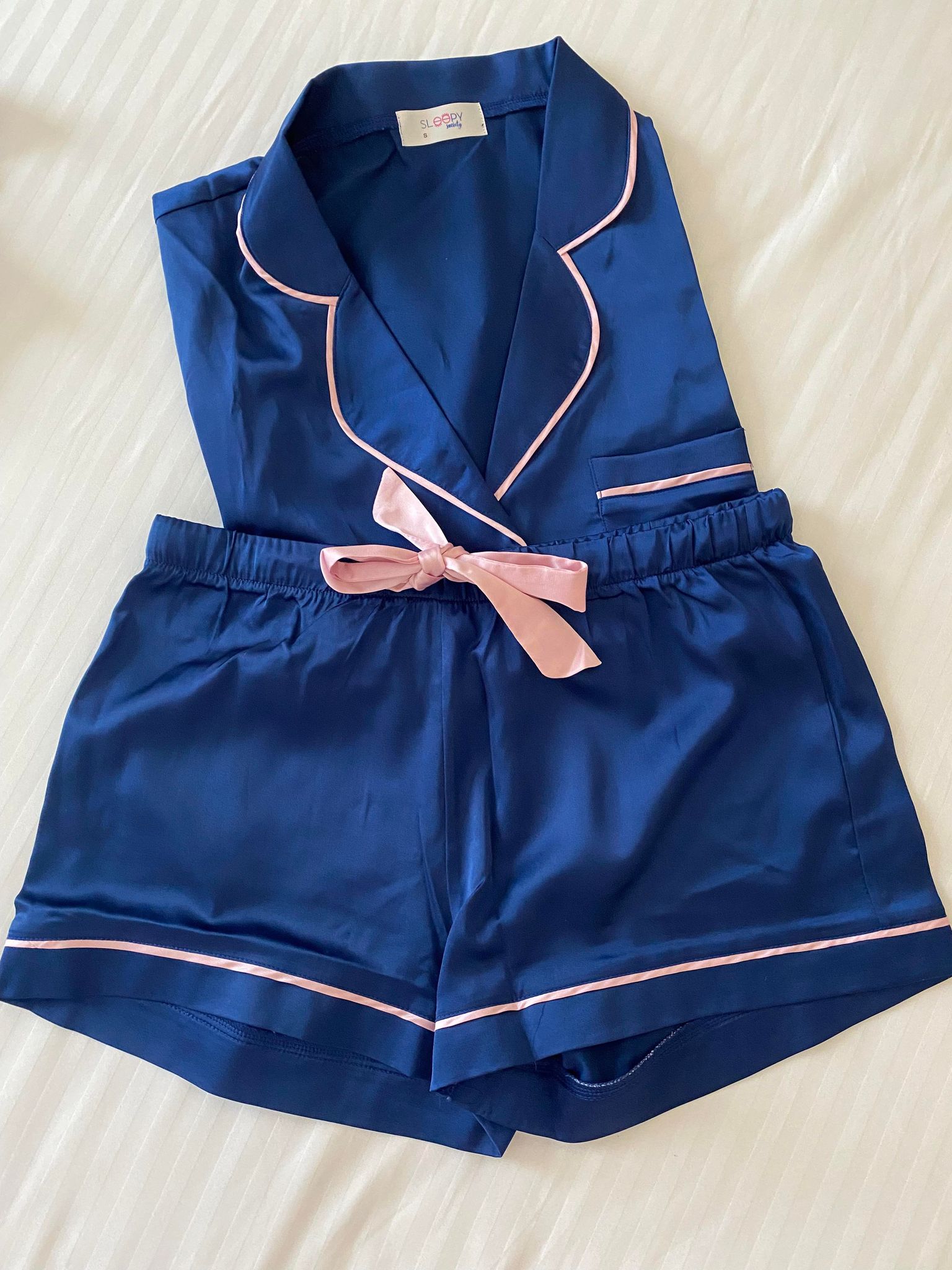 Our satin blue set is contrasted with pink piping and buttons. The material is a soft and lightweight 95% satin and 5% spandex, making it cool and comfortable to wear.