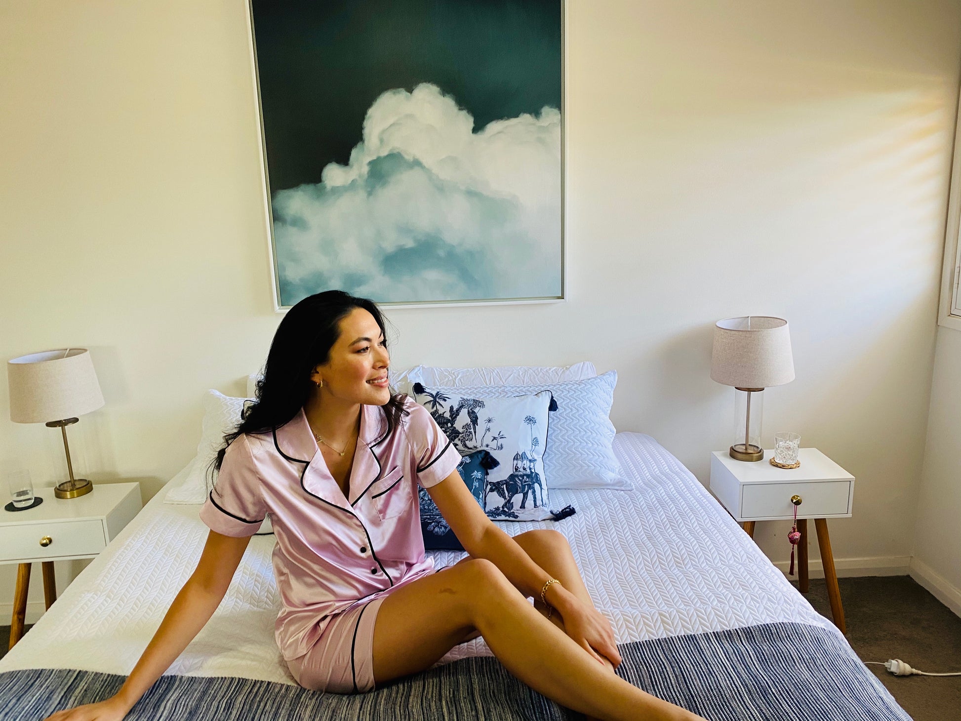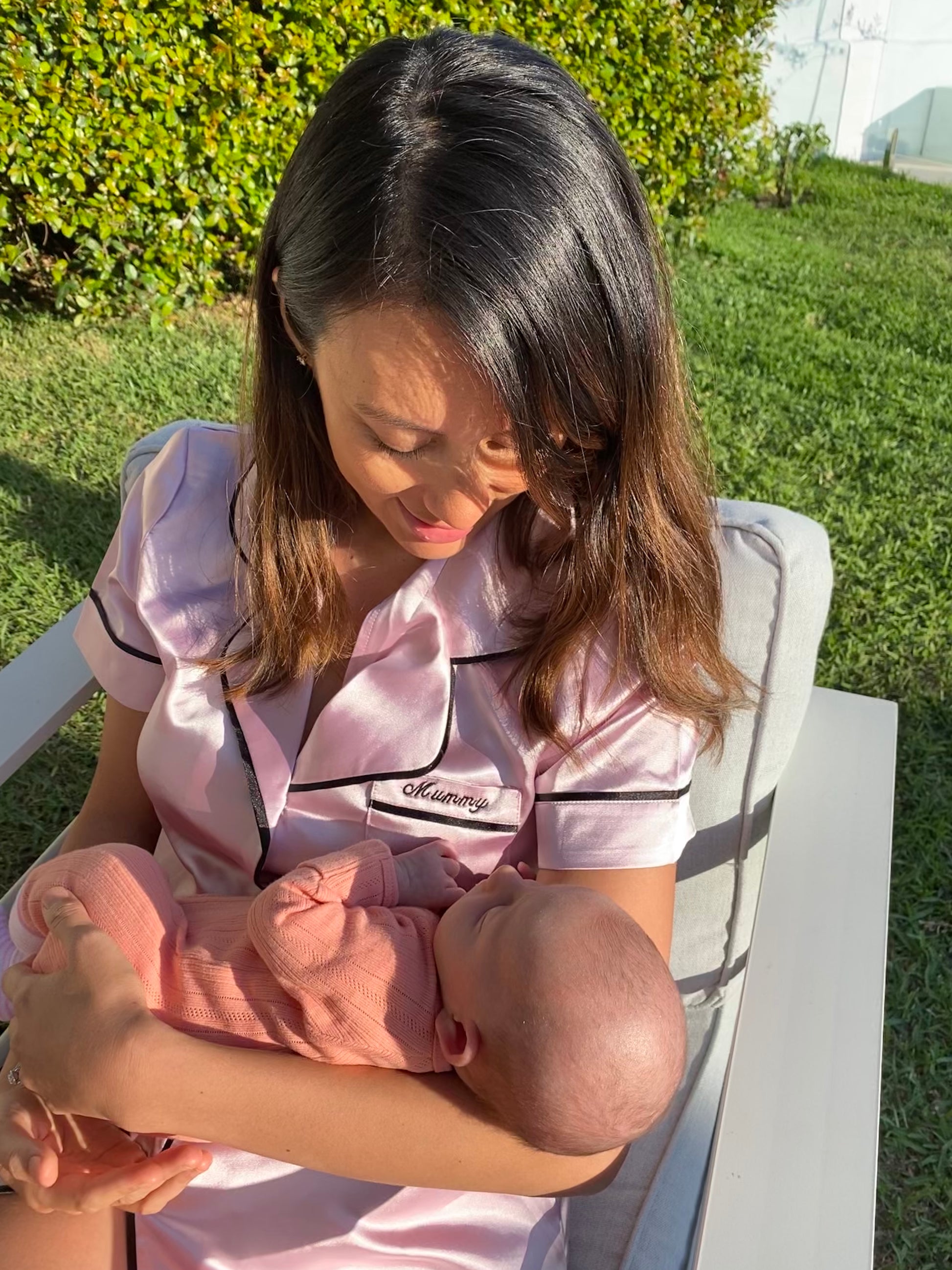 Our Blushing in Pink short set is contrasted with black piping and buttons.