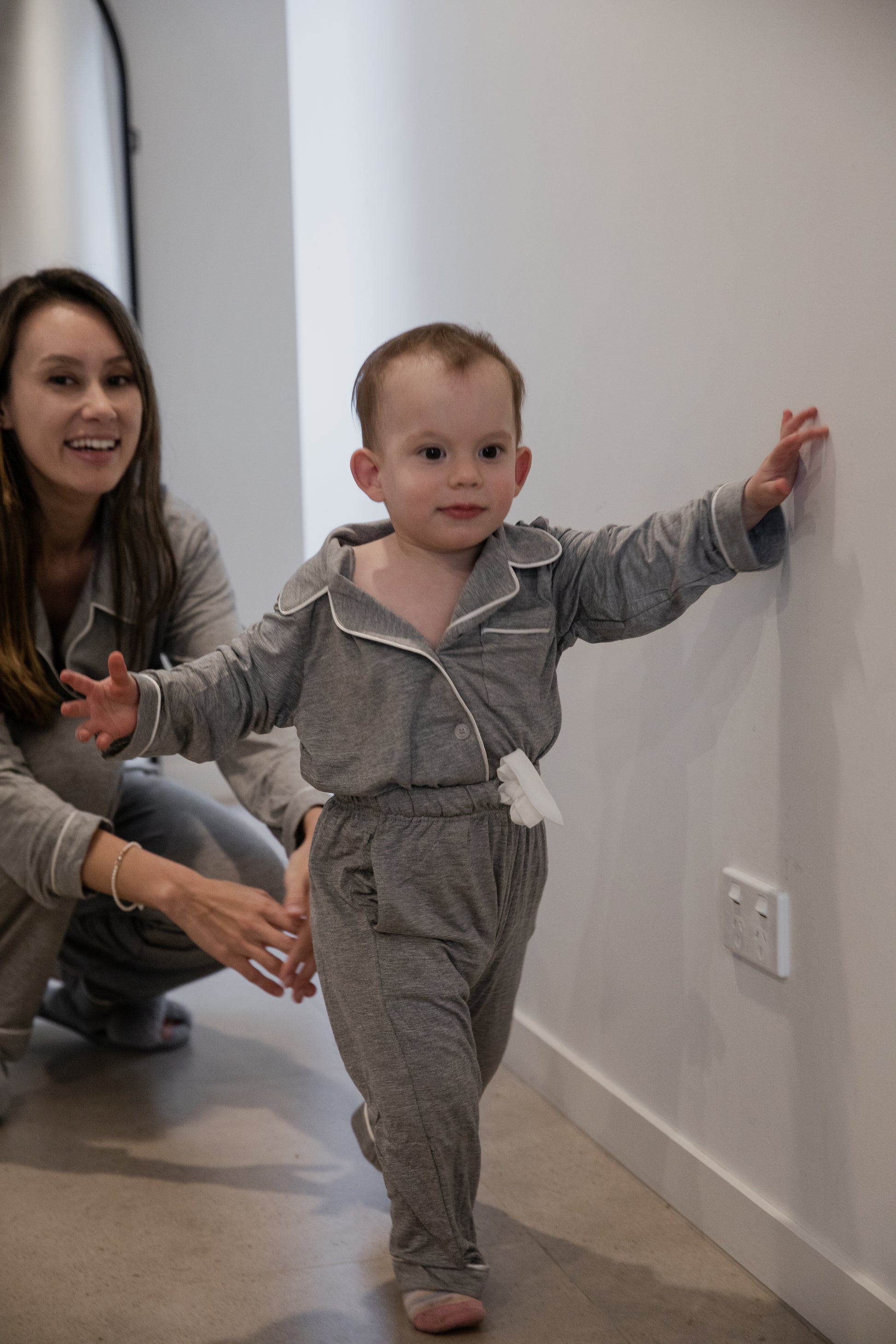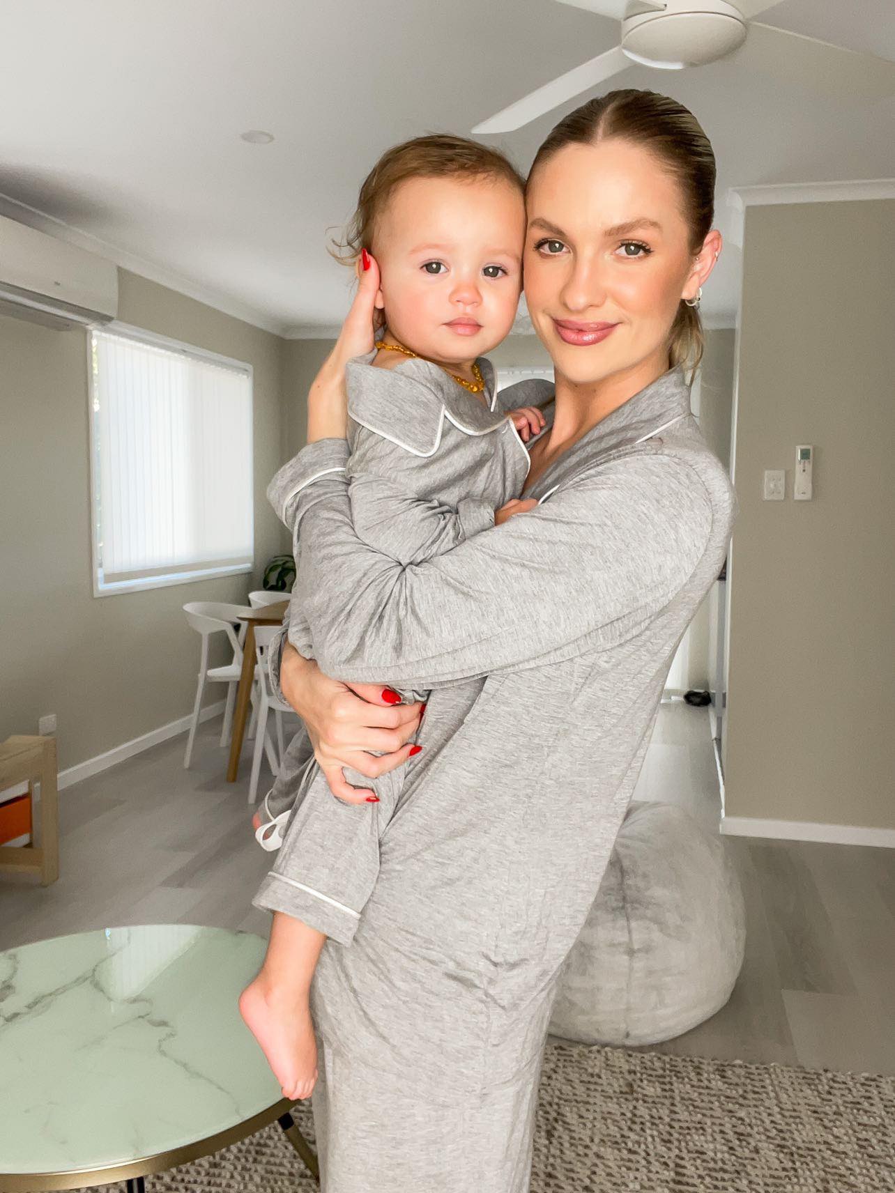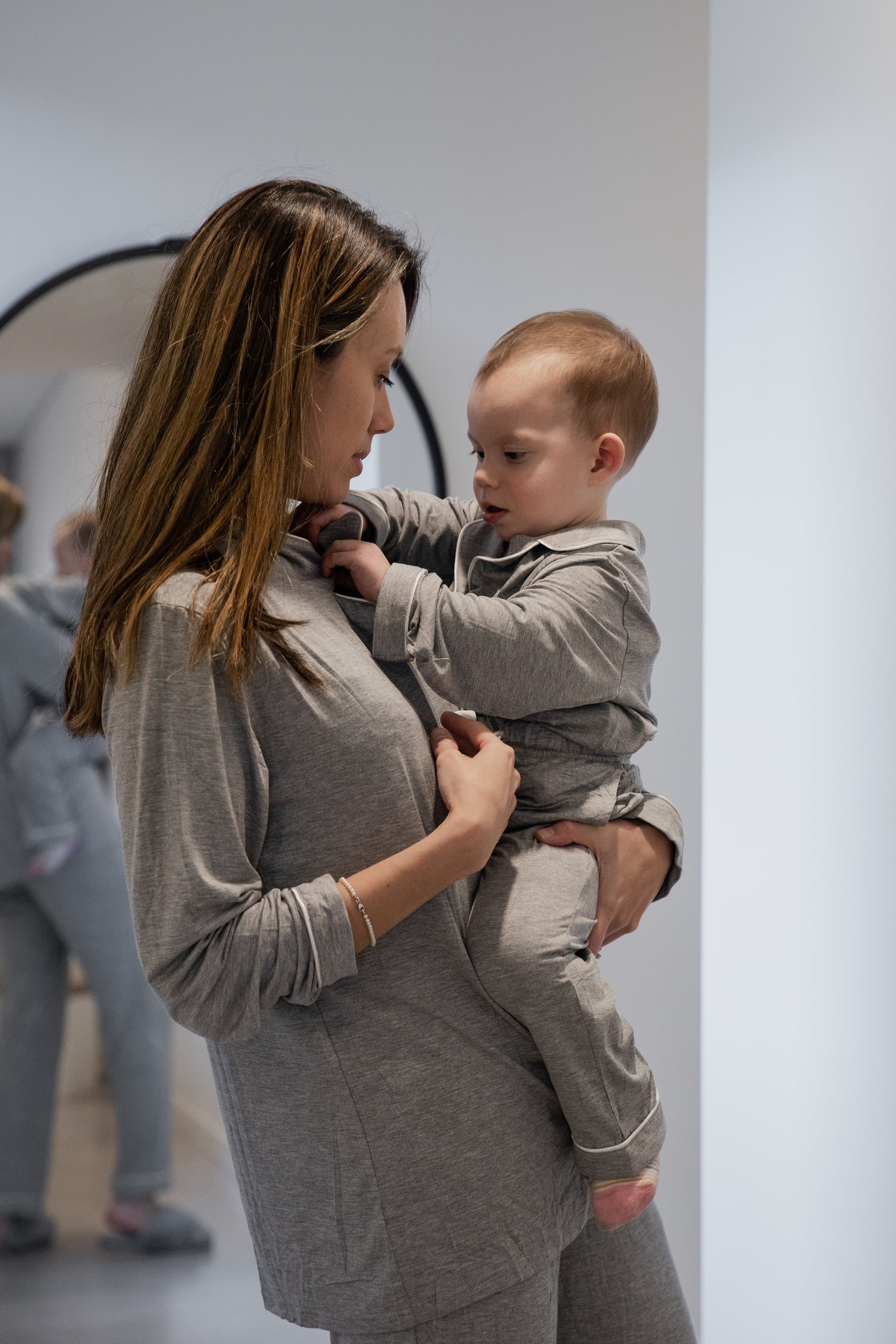 Our Siesta Grey set comes in kids and women's sizing. The grey bamboo fabric is contrasted with white piping around collar, cuffs and hem of pants. The material is 95% Bamboo and 5% Spandex making it soft, breathable and stretchy. It has a thick elasticised waistband, pocket on top and mother of pearl buttons.