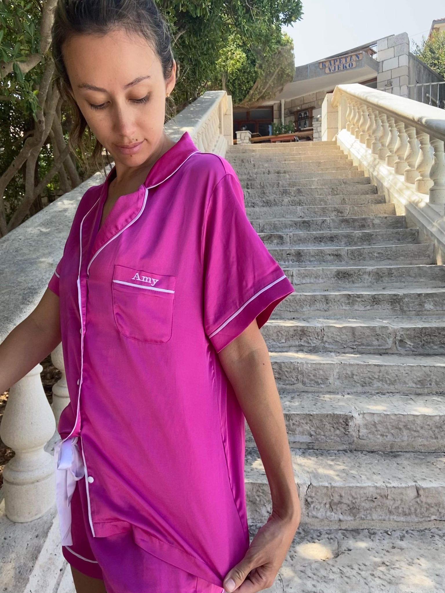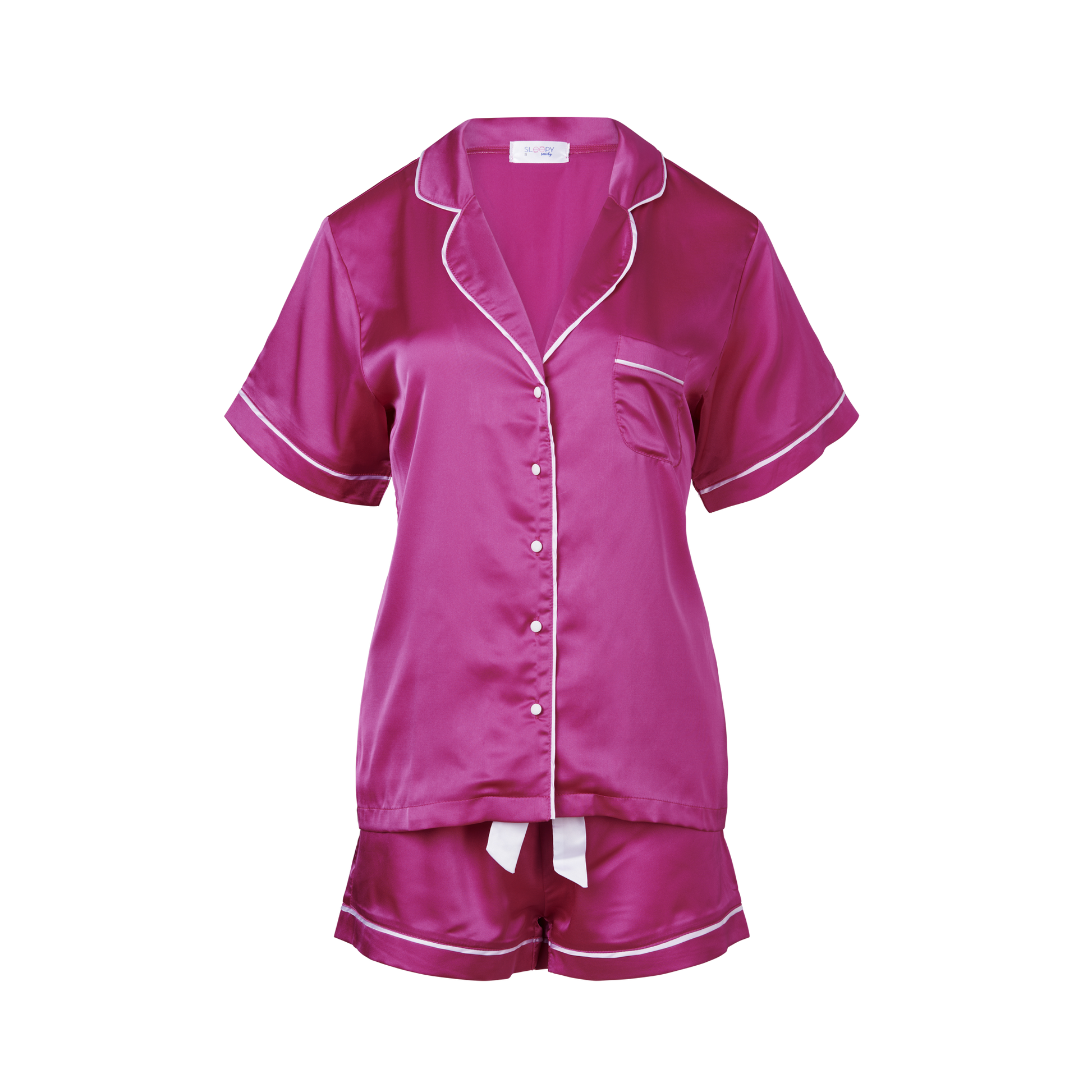Our Hot Pink Daydream short set is contrasted with white piping and buttons. The material is a soft and lightweight 95% satin and 5% spandex, making it cool and comfortable to wear.