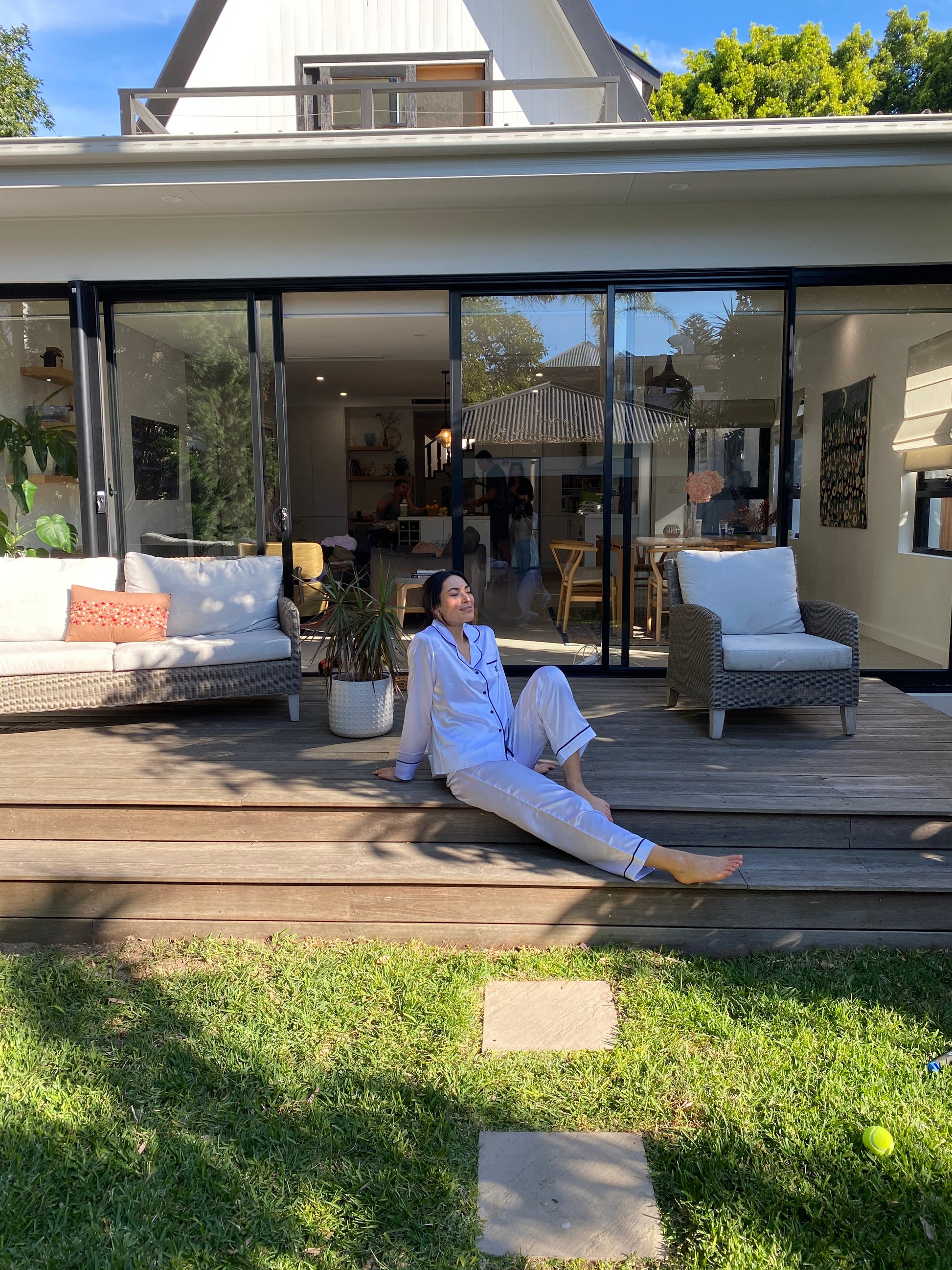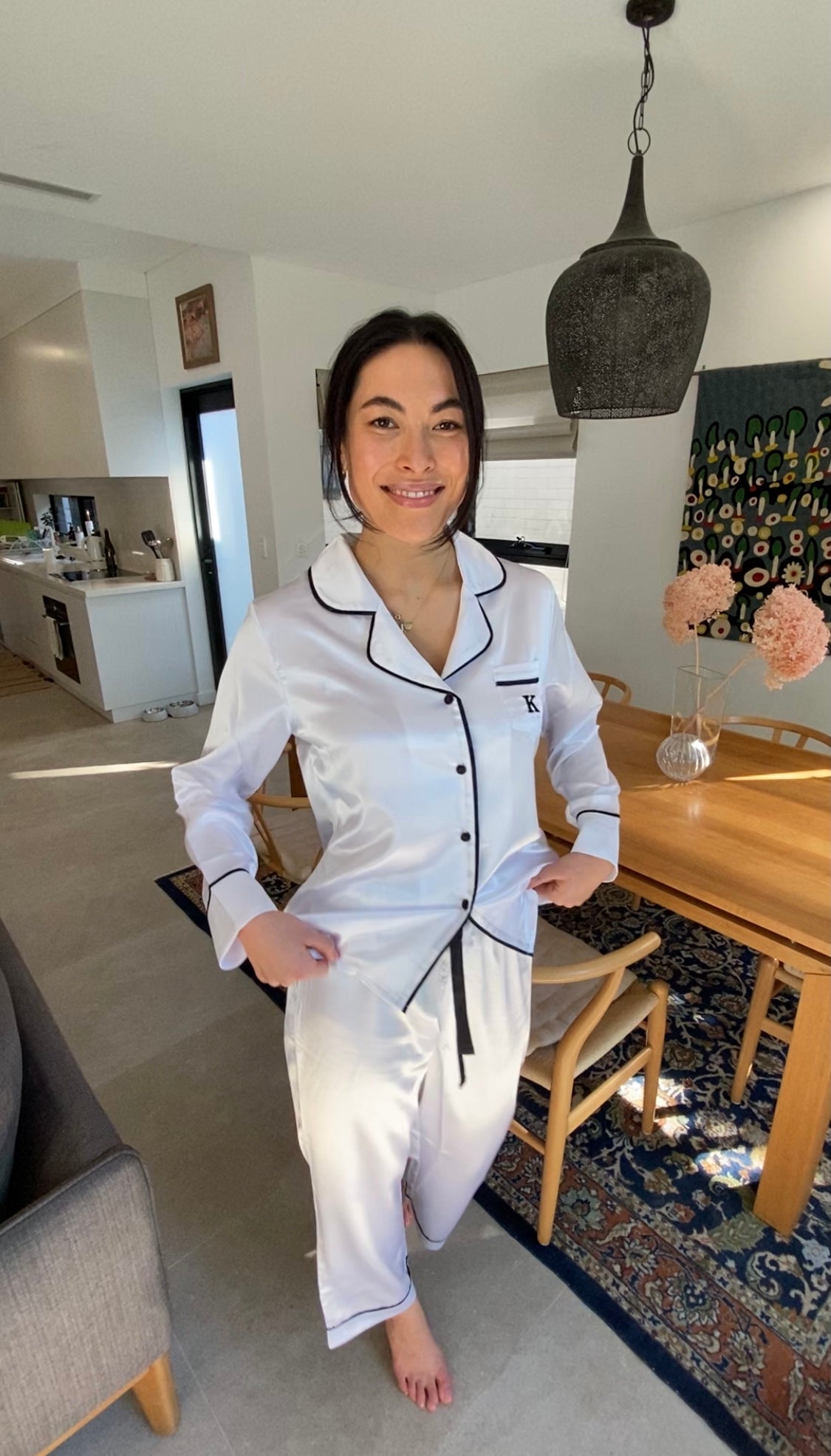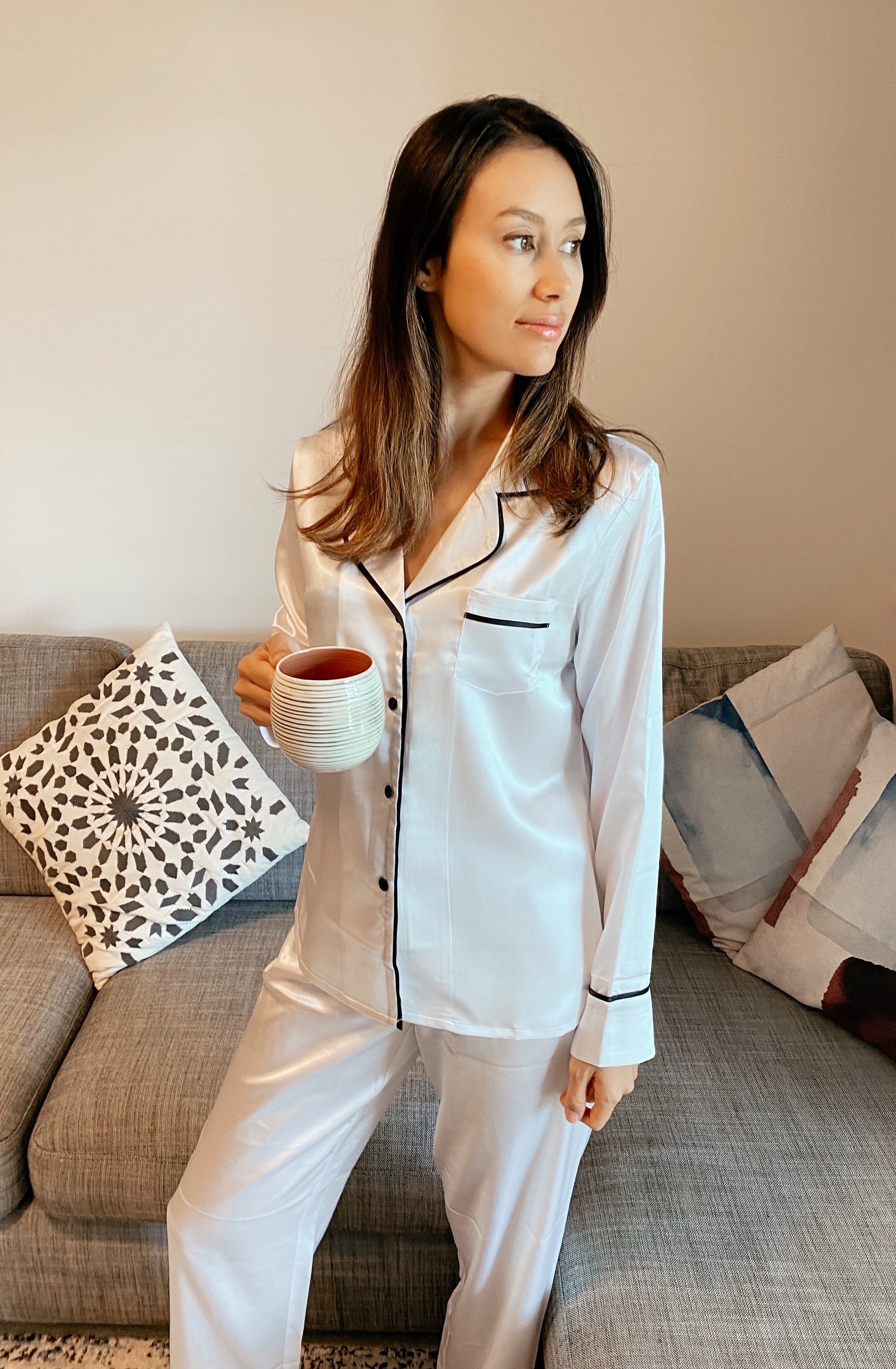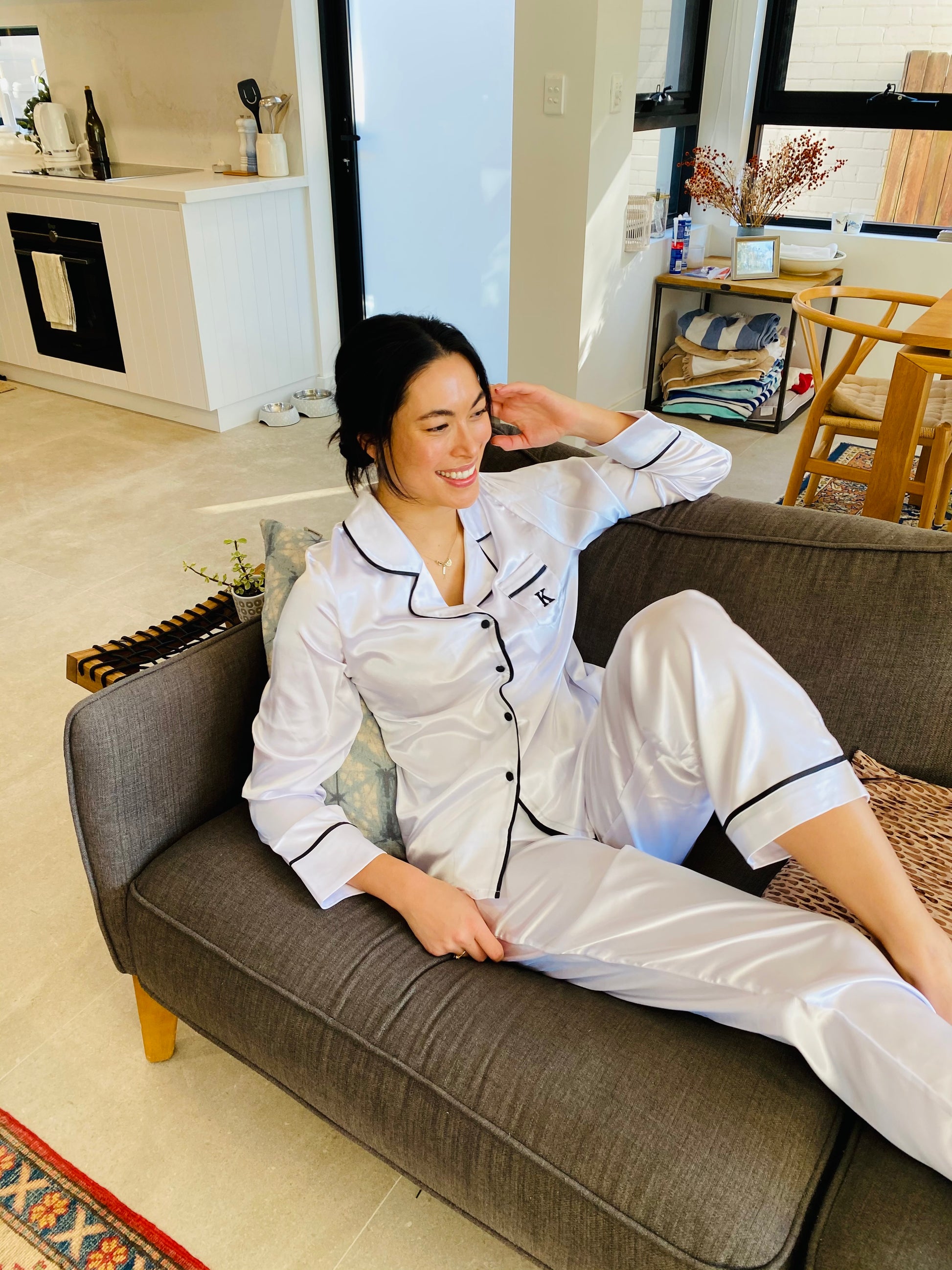 Our Classic Pearl long set is contrasted with black piping, drawstring and buttons.