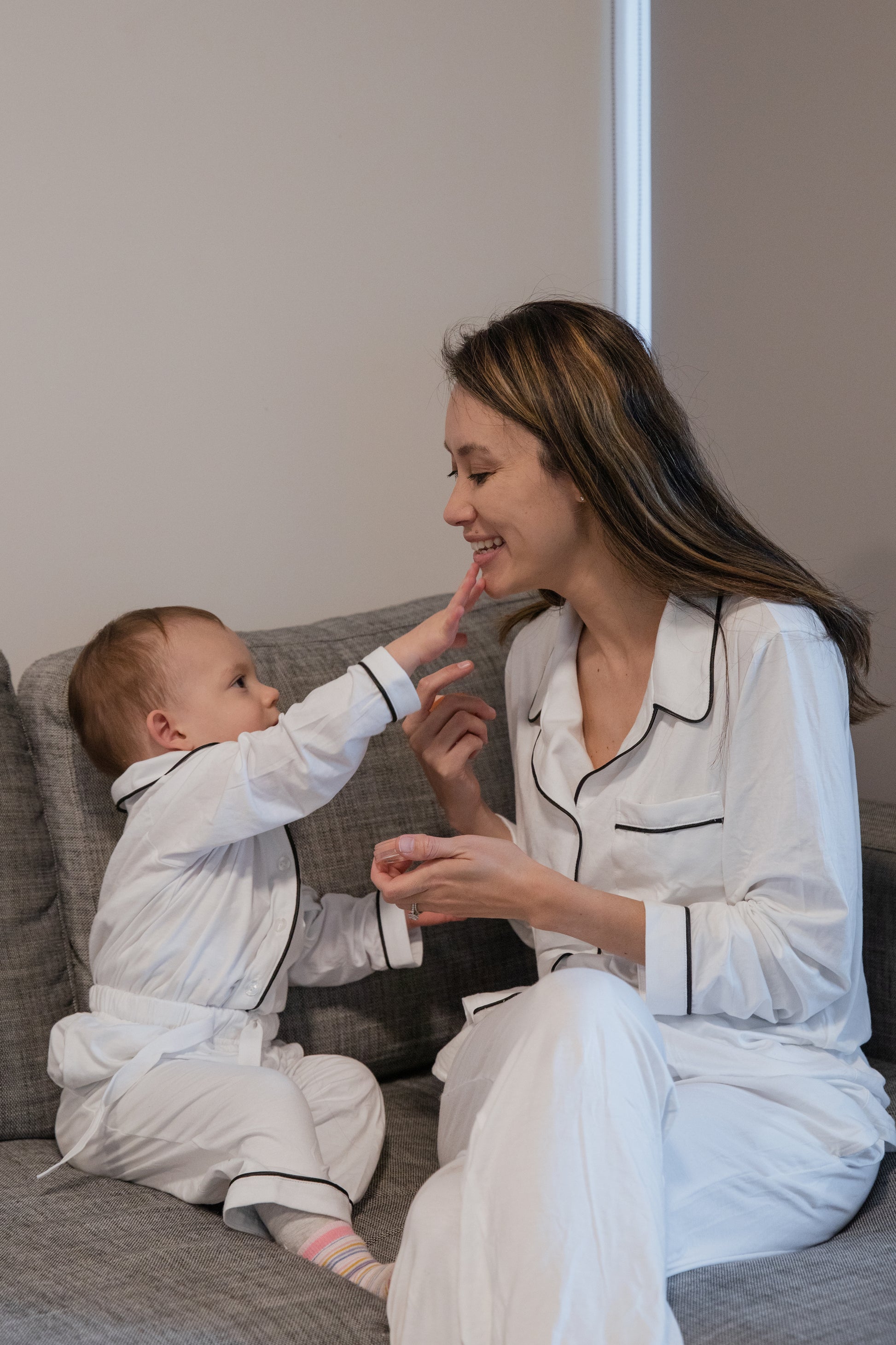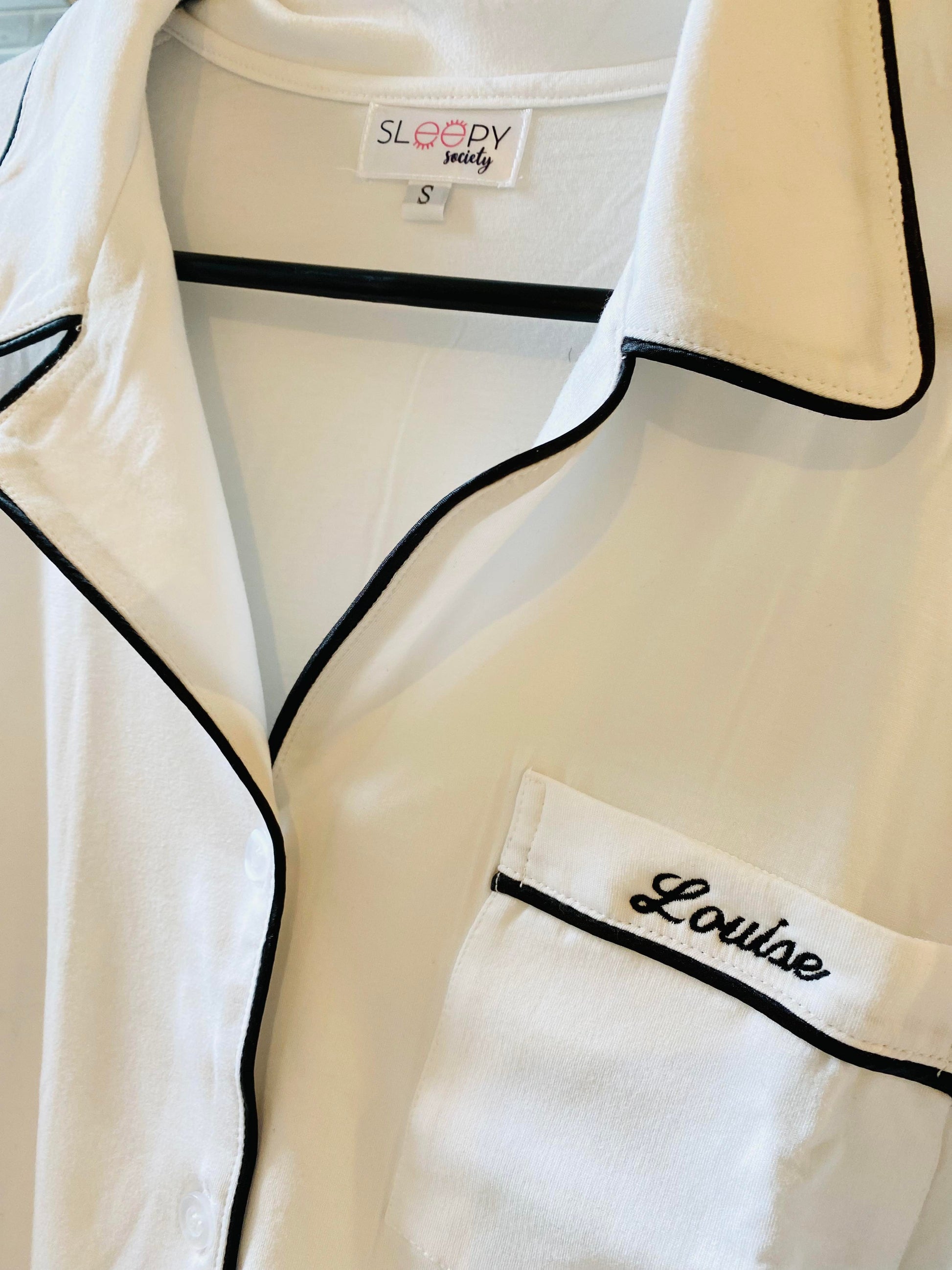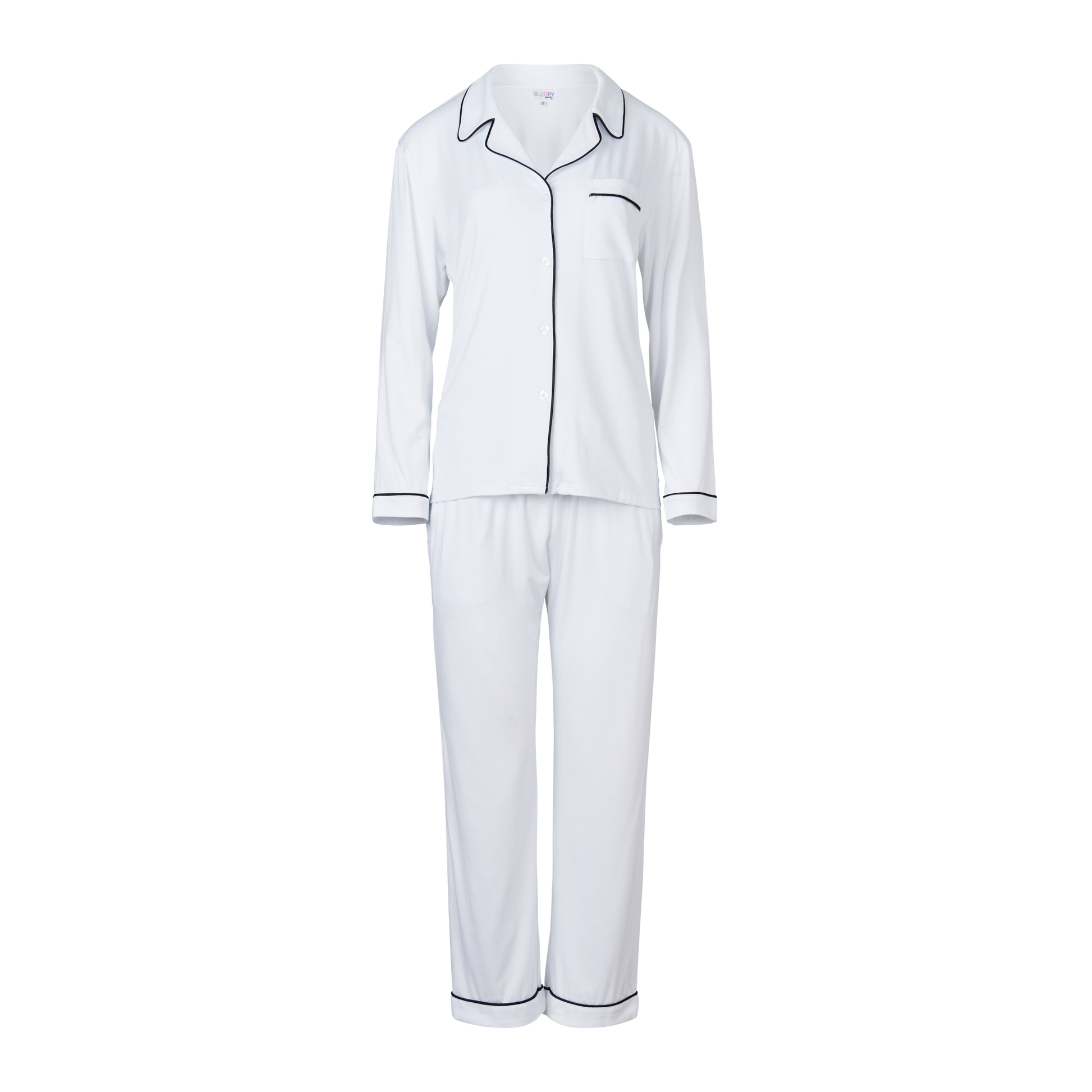Our Cloud White long set comes in kids and women's sizing. The white bamboo fabric is contrasted with black piping around collar, cuffs and hem of pants. The material is 95% Bamboo and 5% Spandex making it soft, breathable and stretchy. It has a thick elasticised waistband, pocket on top and mother of pearl buttons. Optional to personalise your set with embroidery above or on the pocket.