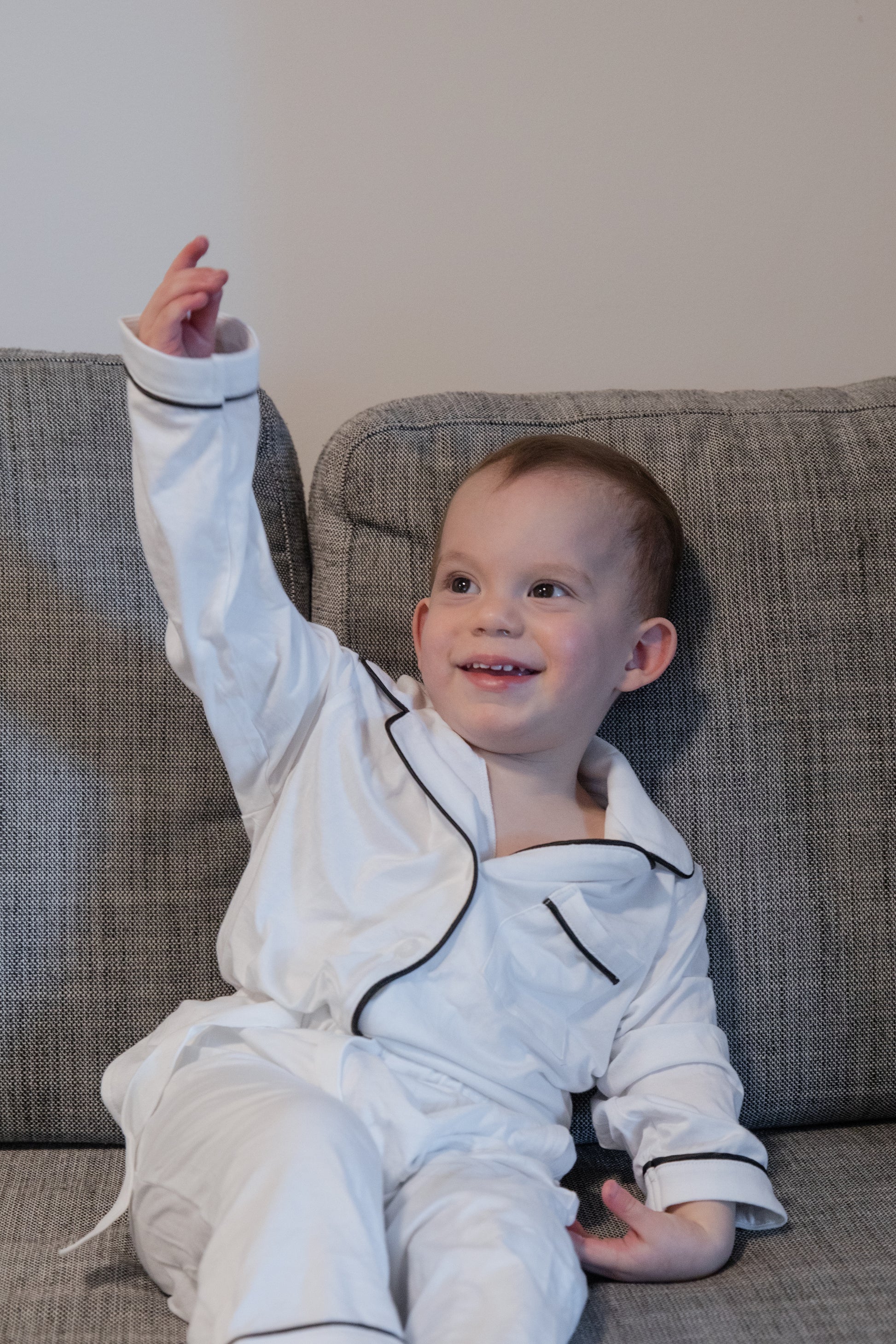 Our Cloud White set comes in kids and women's sizing. The white bamboo fabric is contrasted with black piping around collar, cuffs and hem of pants. The material is 95% Bamboo and 5% Spandex making it soft, breathable and stretchy. It has a thick elasticised waistband, pocket on top and mother of pearl buttons.